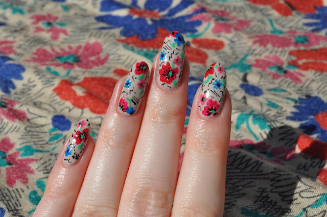 The little finger nail went wrong but I couldn't be bothered to re do it especially with that awful formula haha. By the middle finger I was really into the swing of the design. So that's why the better fingers are from the middle onwards, it always happens that way! I used my nail supreme pens in red, blue and pink, the black was done with my wah pen and the green is Barry M Spring Green applied with a dotting tool.